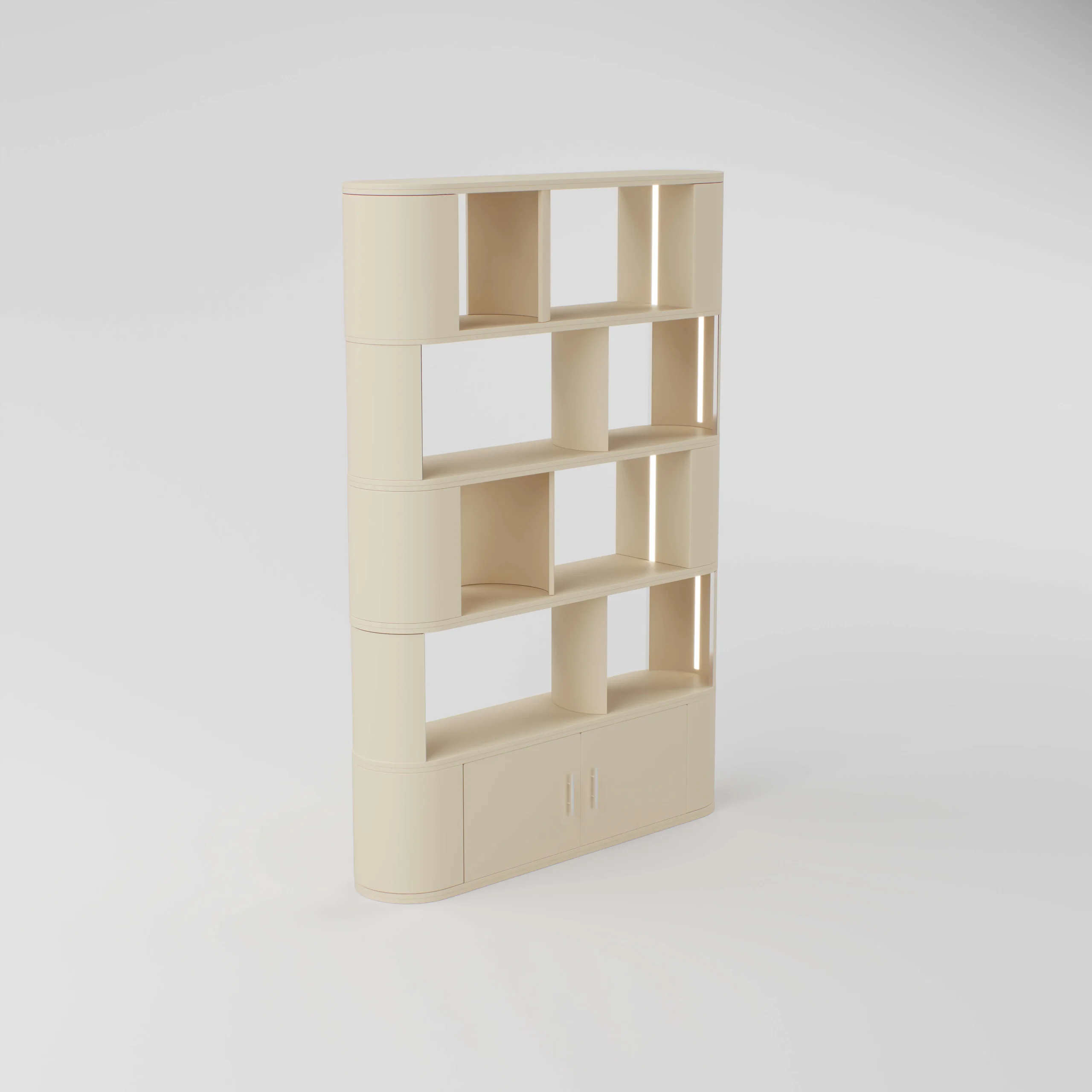 The warm glow of LED lighting accentuates every curve and texture, turning functional storage into a piece of salon art.